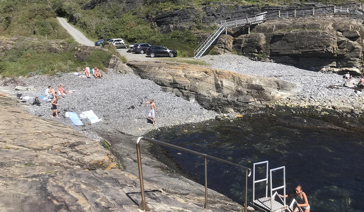 Popular bathing place near Langesund with attractive smooth sloping rocks. Signposted path from Langesund.