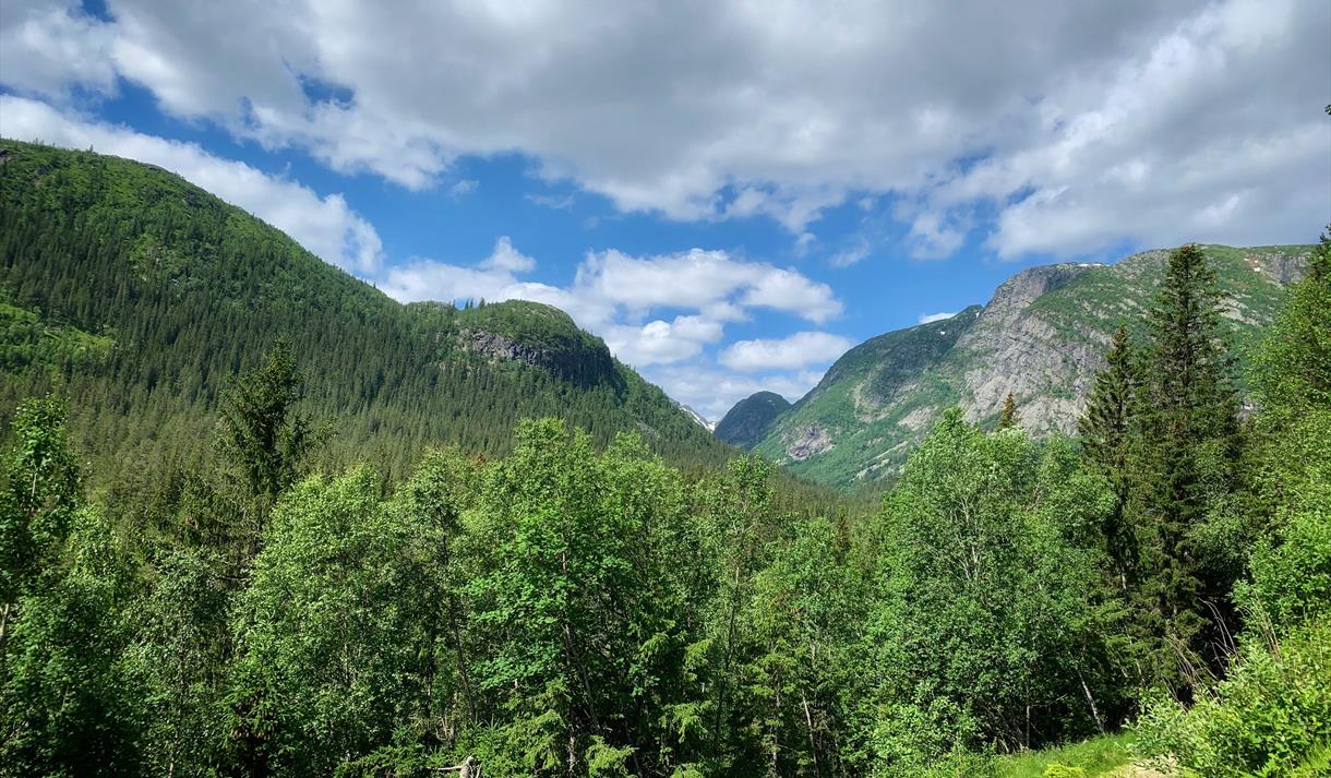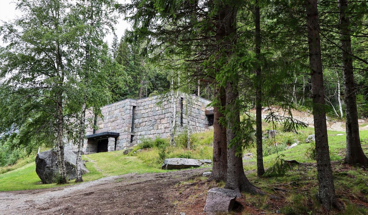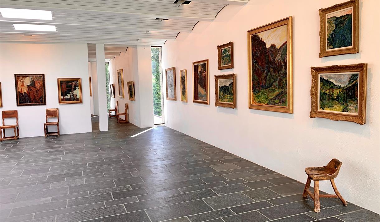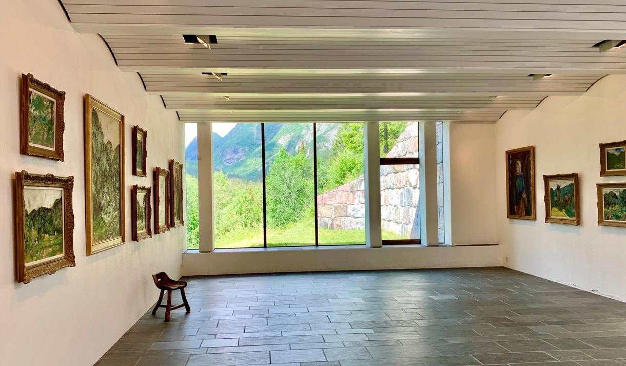 The valley of Smørklepp in Vinje made a lasting impression on the famous Norwegian artist Henrik Sørensen, and a large collection of his paintings is exhibited at Vinje Gallery situated in this impressive landscape. The gallery from 1991 is a distinctive building constructed by local rock.