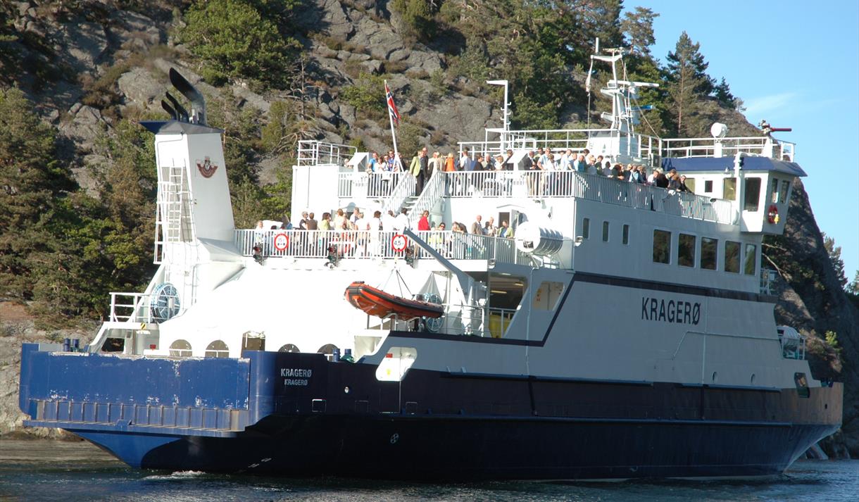 M/F Kragerø is 44 m long and 12 m wide. It can take up to 250 passengers and 25 vehicles. The ferry has a lounge with a sitting place for 120 persons together with seats for 80 persons outside. There is a cafeteria on board.