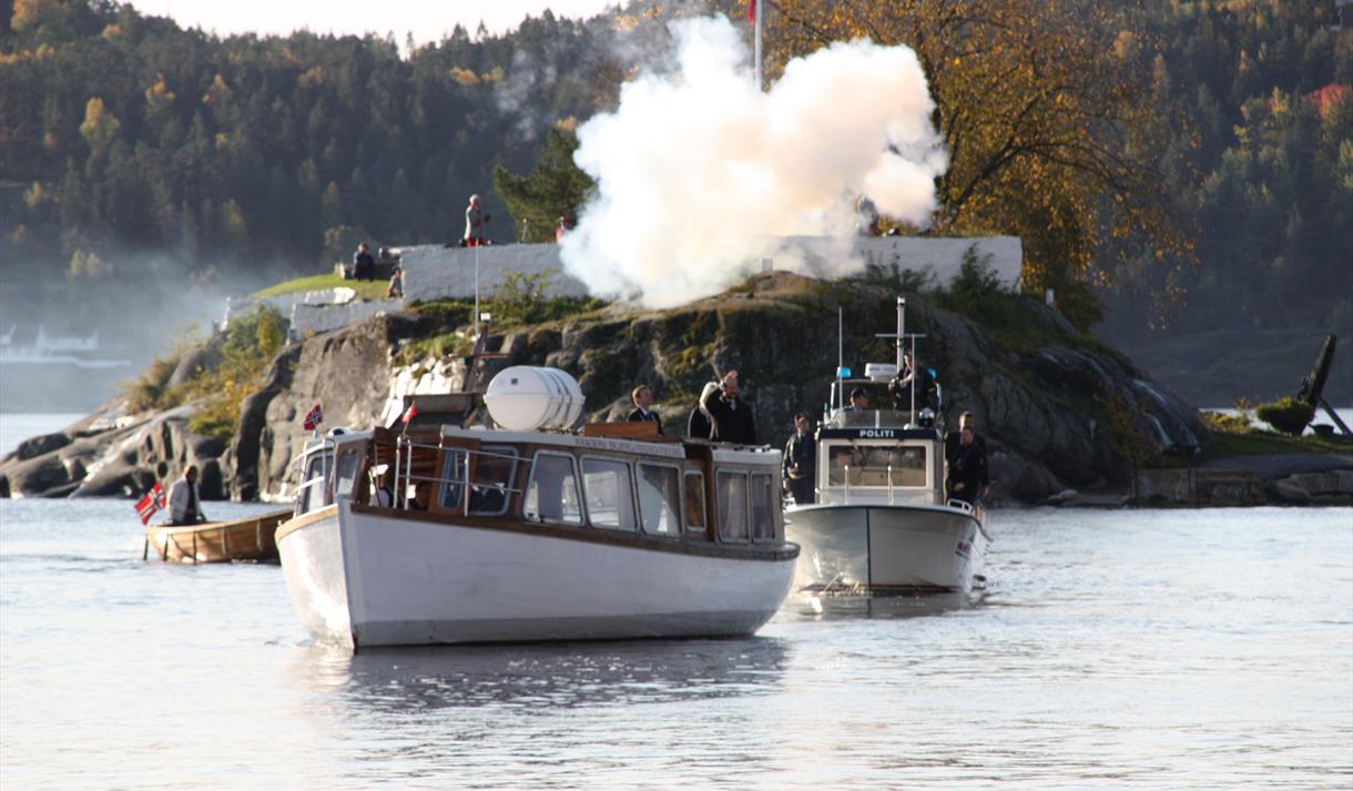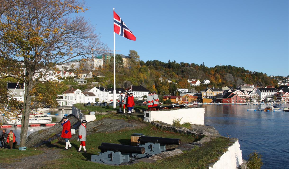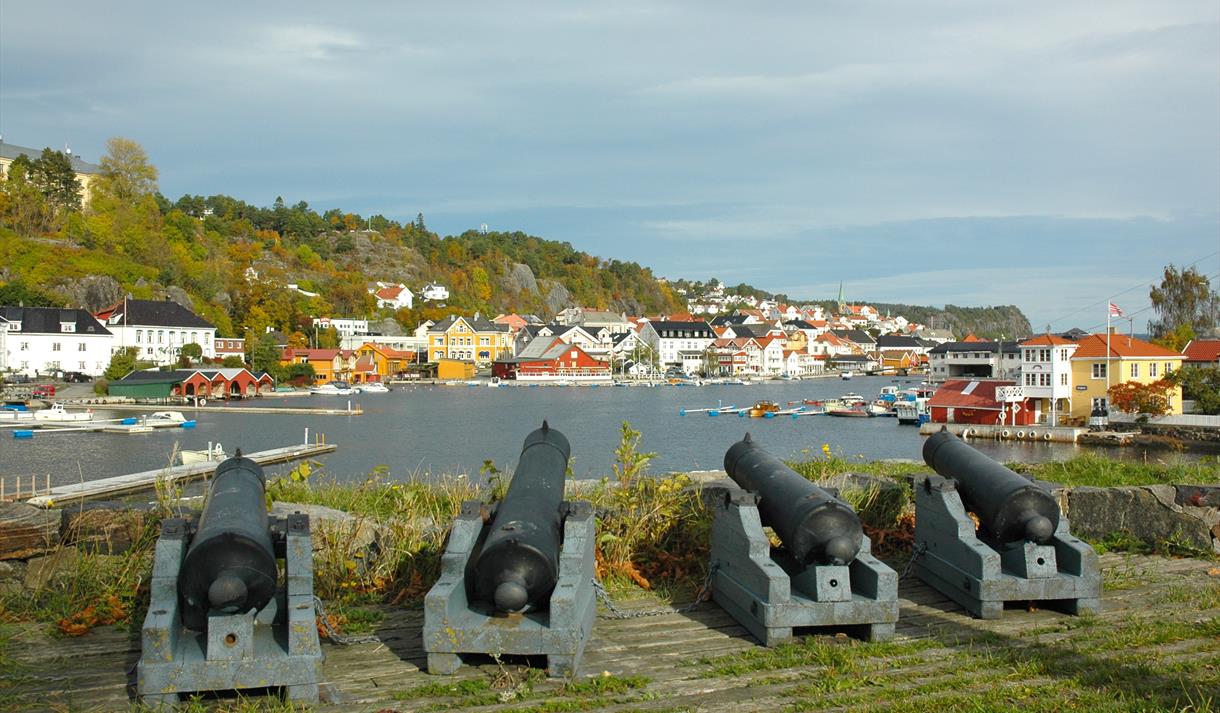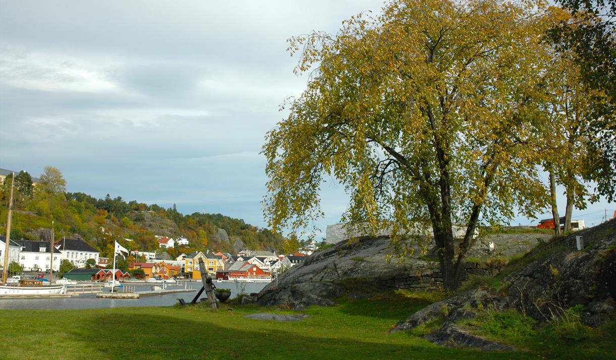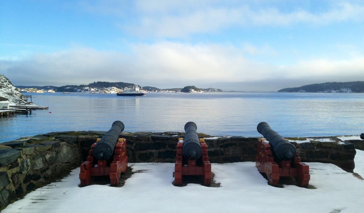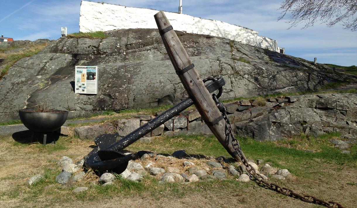In 1808 tried the English frigate "Tarter" to invade the town, but was chased by the canons of the coastal fort. The fort has been restored to its original condition, and is connected to the mainland by a pier. Every year Gunnarsholmen is visited by tourists and locals. The anchor by the coastal fort is from around 1850 and was found in Tallakshavn in Kragerø.