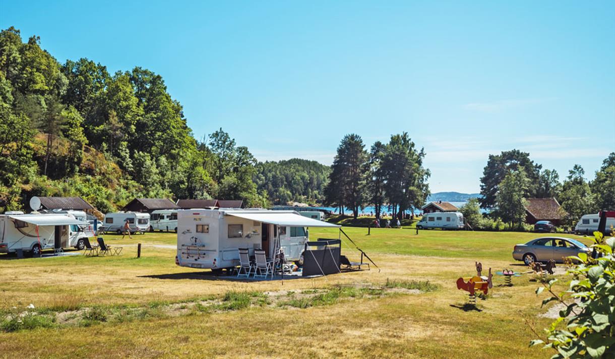 Welcome to the idyllic Olavsberget swimming area (Badeplass), a popular destination located by Olavsberget Camping and the beautiful Eidanger Fjord in Porsgrunn. This is the perfect sandy beach in Telemark for a day with family and friends, whether you prefer playing in the sand, diving from the tower, or sunbathing on the coastal rocks (svaberg).
