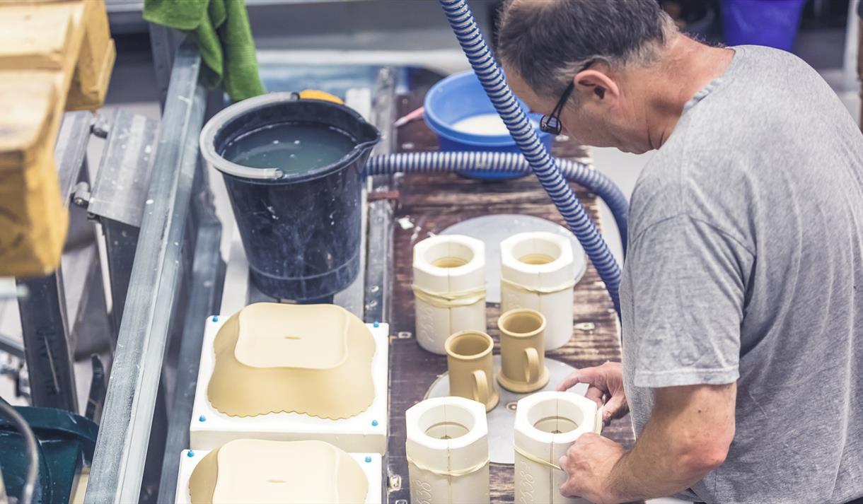 Since the establishment, there has been continuous production of highly fired porcelain in the factory buildings located idyllically along the Porsgrunn river. Here you can see the porcelain from casting to burning.