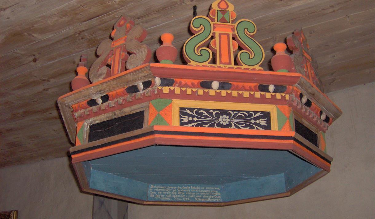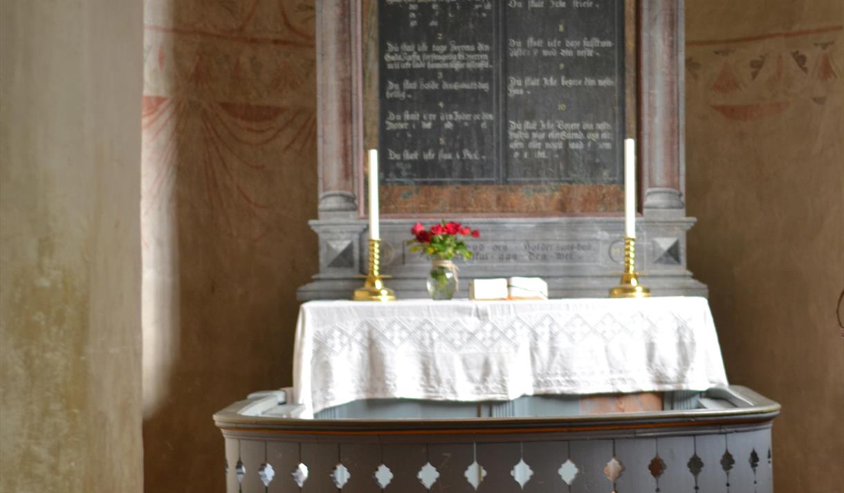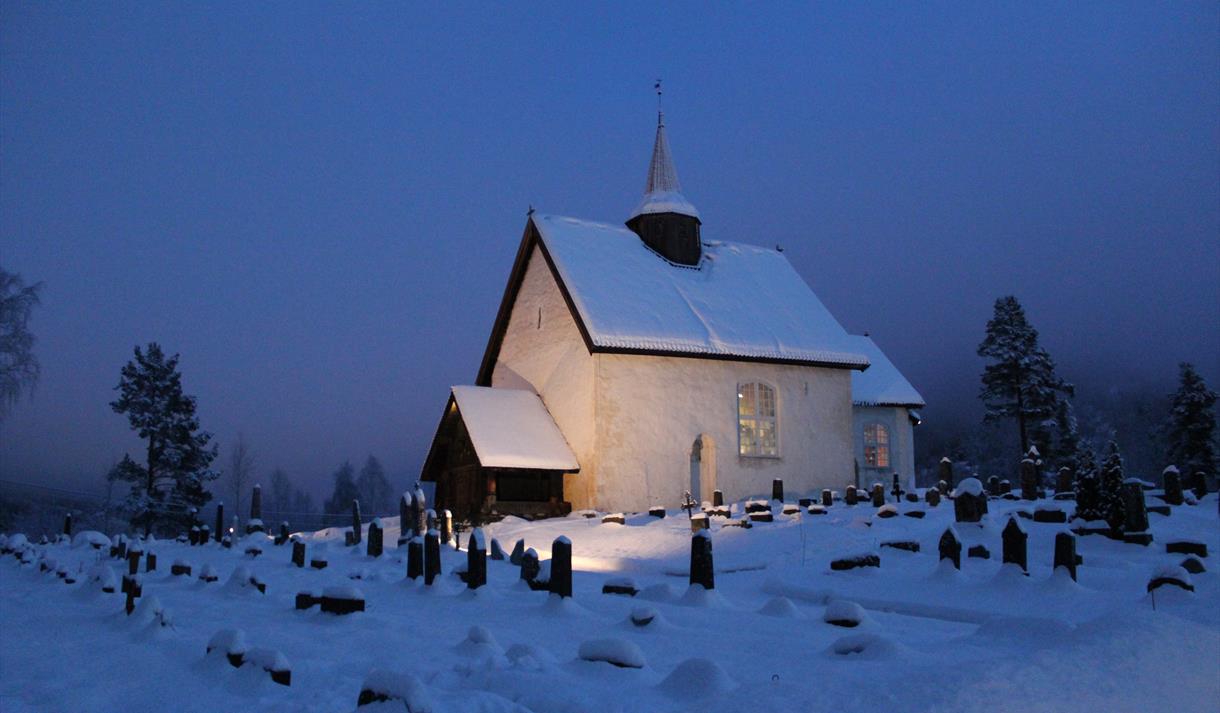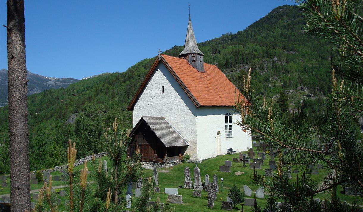 The church was built in the romanesque style at some time in the 12th century. It is dedicated to St Olav. On the north-west corner of the church a face has been hewn. This, according to legend, represents the saint king. Another legend says that the church was built by a goblin. When the building was complete the goblin fell to his death. To this day no grass grows on the spot where he fell. The church has an altarpiece from 1588 and a font from the 17th century. Under the direction of the Inspector of Ancient Monuments and Historic Buildings an extensive restoration was carried out which was completed in 1972.