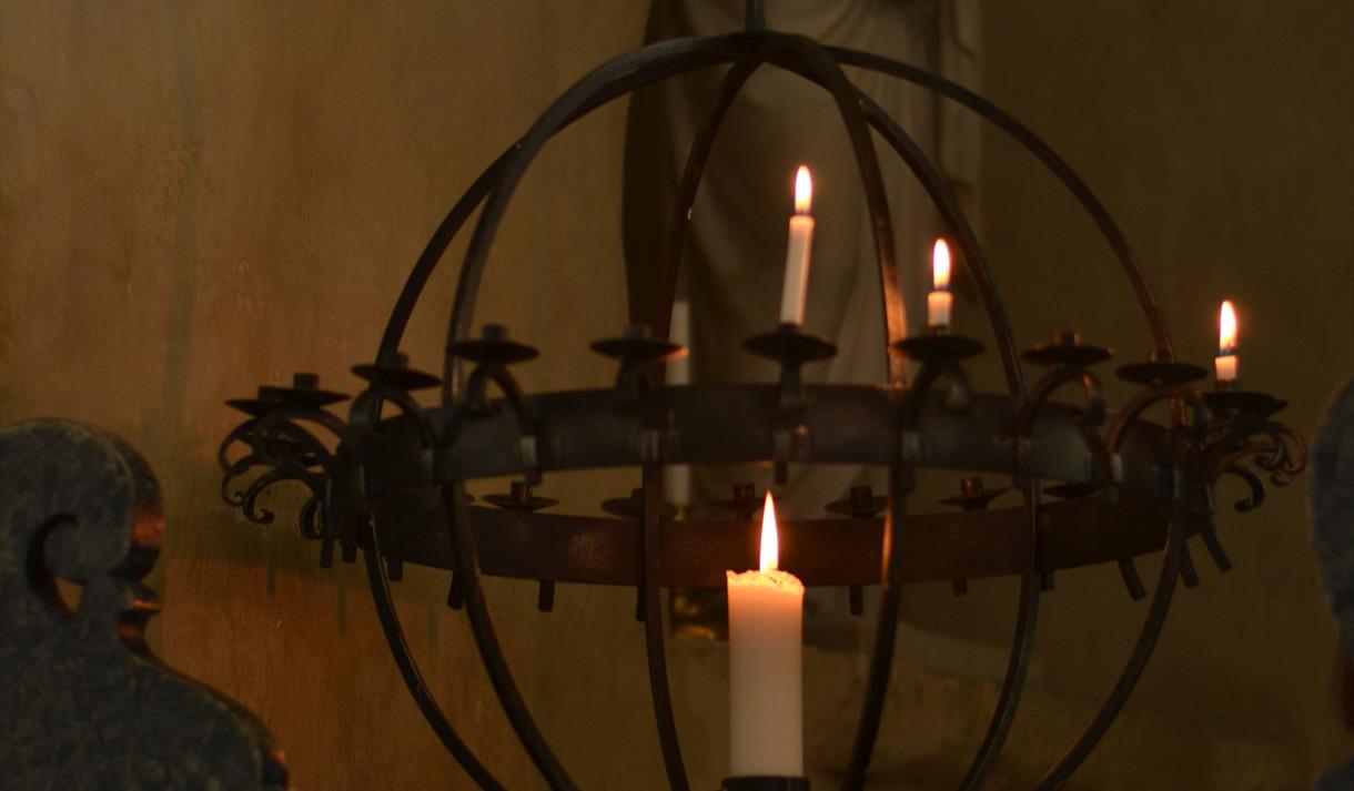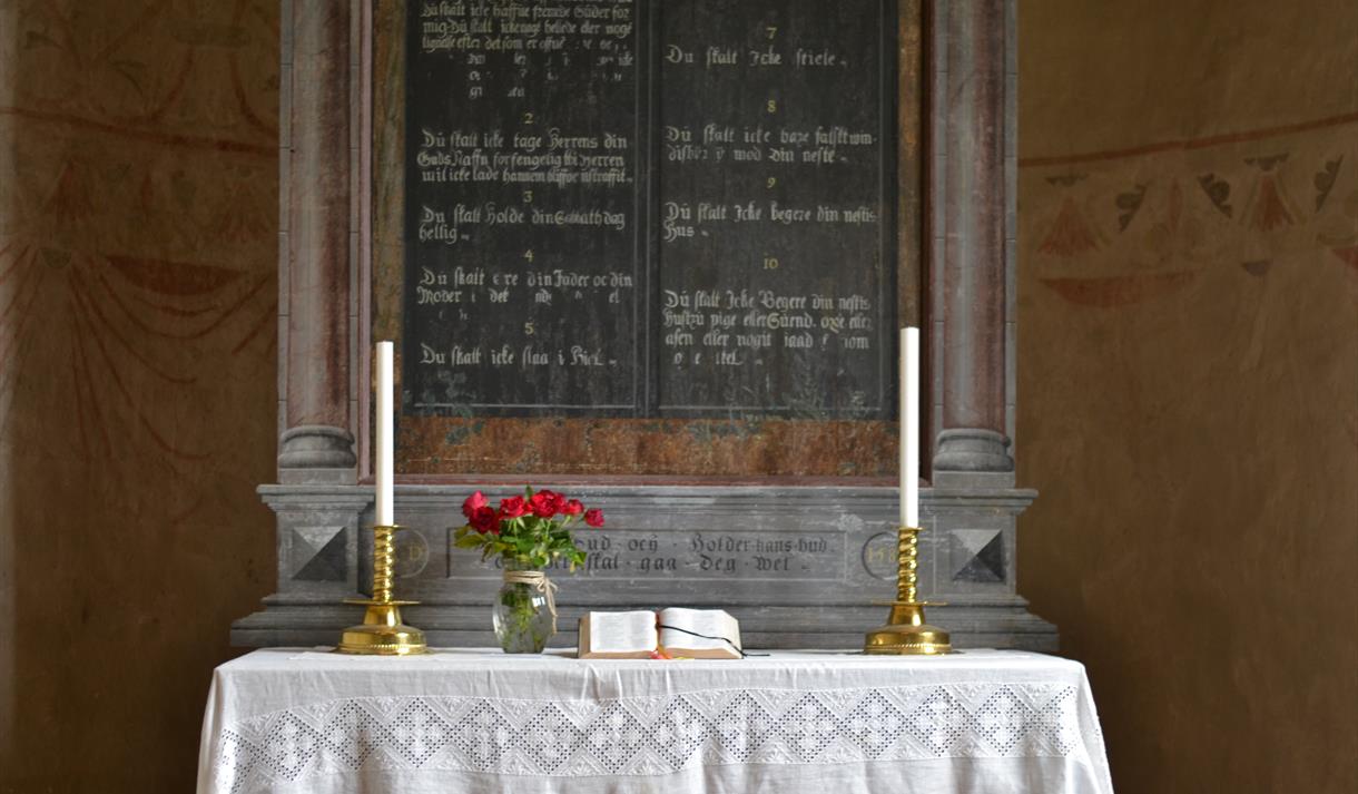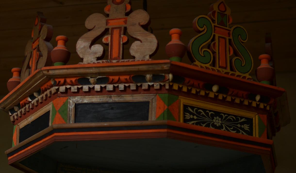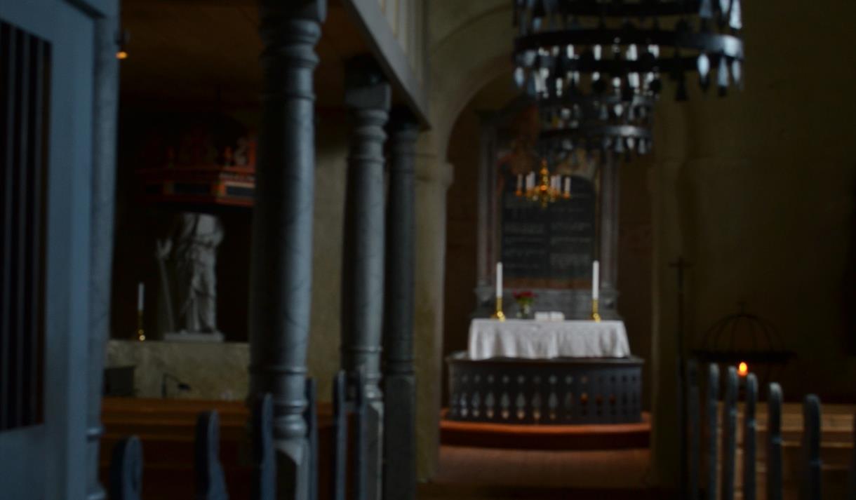 The church was built in the romanesque style at some time in the 12th century. It is dedicated to St Olav. On the north-west corner of the church a face has been hewn. This, according to legend, represents the saint king. Another legend says that the church was built by a goblin. When the building was complete the goblin fell to his death. To this day no grass grows on the spot where he fell. The church has an altarpiece from 1588 and a font from the 17th century. Under the direction of the Inspector of Ancient Monuments and Historic Buildings an extensive restoration was carried out which was completed in 1972.