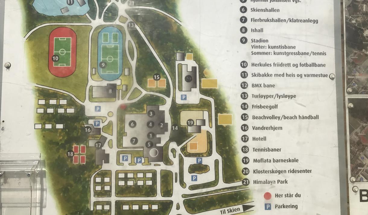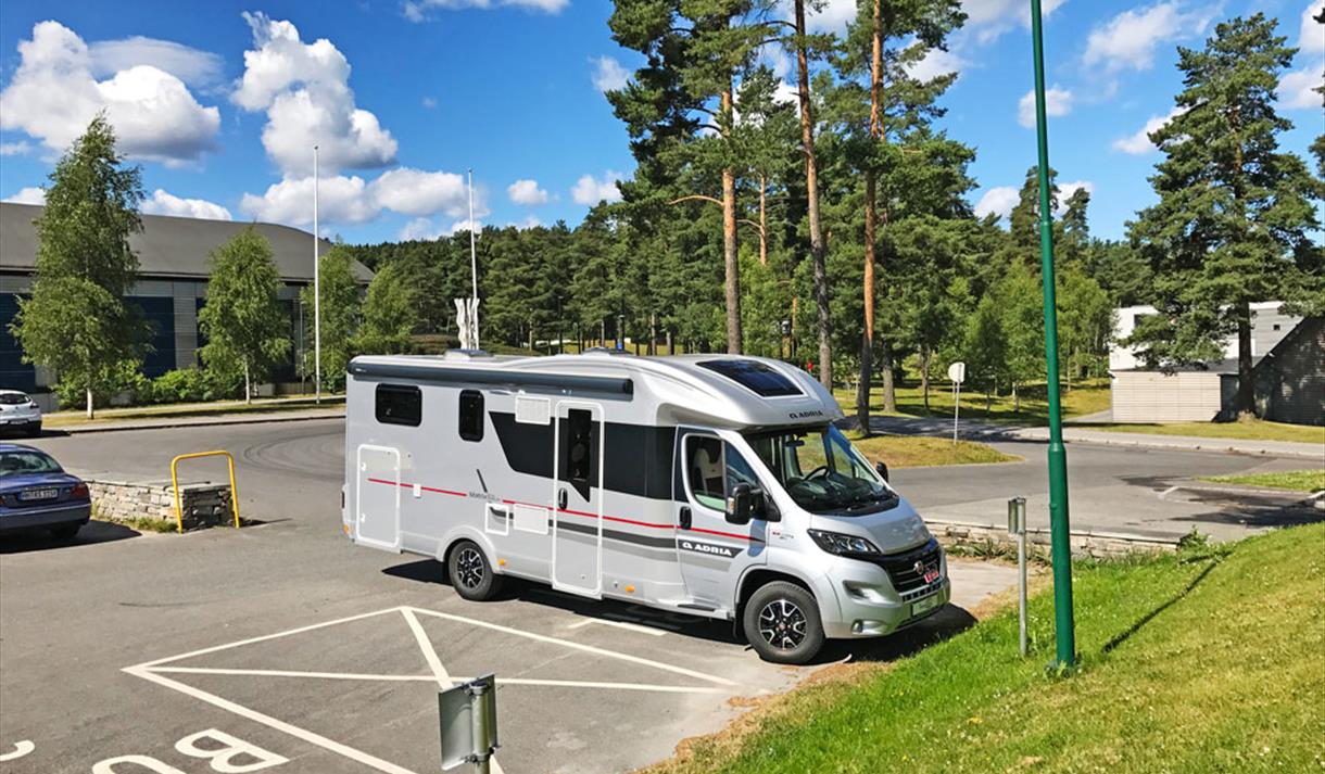 The motorhome parking is located in the heart of Skien Leisure Park. Here, you stay in an idyllic setting with a wide range of activities for the whole family just outside your motorhome door. For example, the Climbing Park, curling, mini golf, frisbee golf, a large outdoor area, football fields, sand volleyball, indoor climbing wall, sports halls, ice rink, café, and more.
