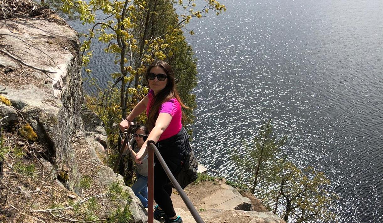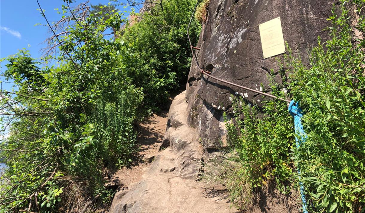 By boat you can moor just below the cave. There is a steep path from the water up to the cave. This has both steps and railings.