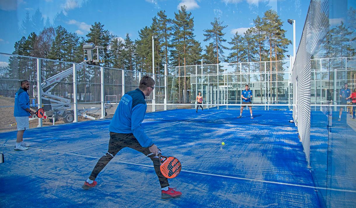 Padel is a mix of squash and tennis. It is usually played in double format (4 people) on a closed glass court. The court is one third the size of a tennis court. You can book the courses online, but they are also open for drop-in. You can bring your own equipment or rent it at the Café Pucken. Season is from April - October.