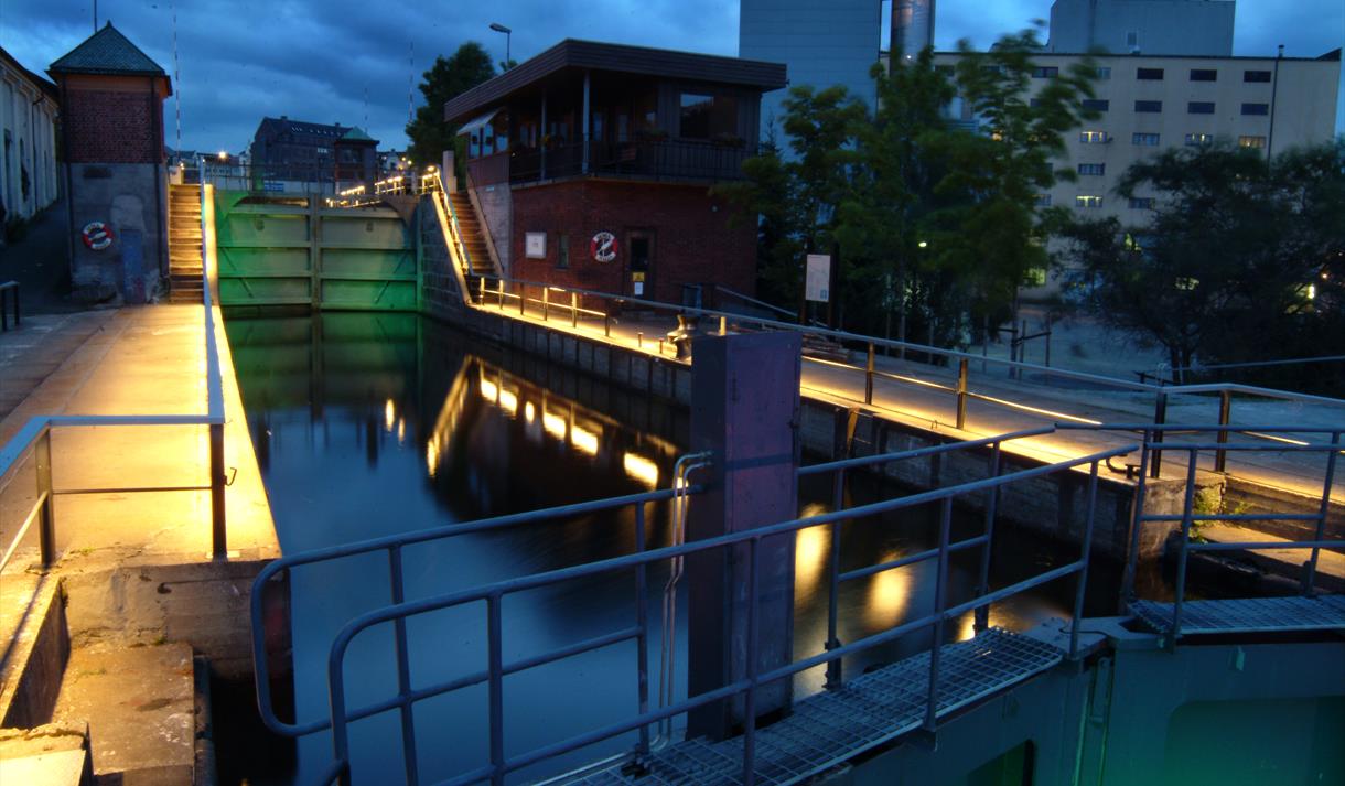 Skien lock is the first closure facility in the Telemark Canal. Below the locks it's a breakaway for pleasure boats. Above the locks, in Hjellevannet. you can find guest harbor and service facilities.