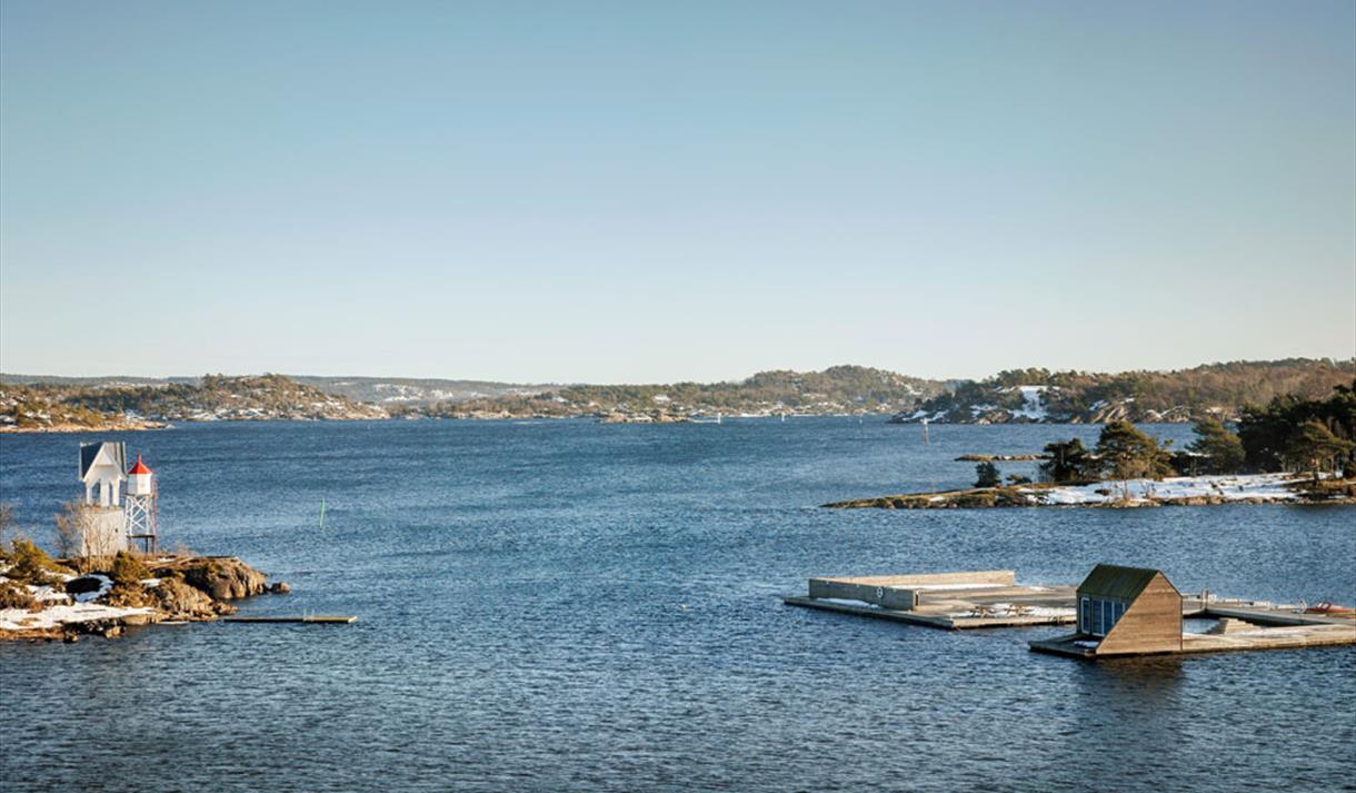 At the pier area of Quality Hotel Skjærgården, you will find a floating sauna with space for 10 people. The sauna includes a changing room and shower, and you can cool off in the sea bath outside. The outdoor areas feature a diving board and terraced piers for relaxation or exercise. The sauna is accessible by foot from Badeparken or by boat, with the option to moor your boat at the pier.