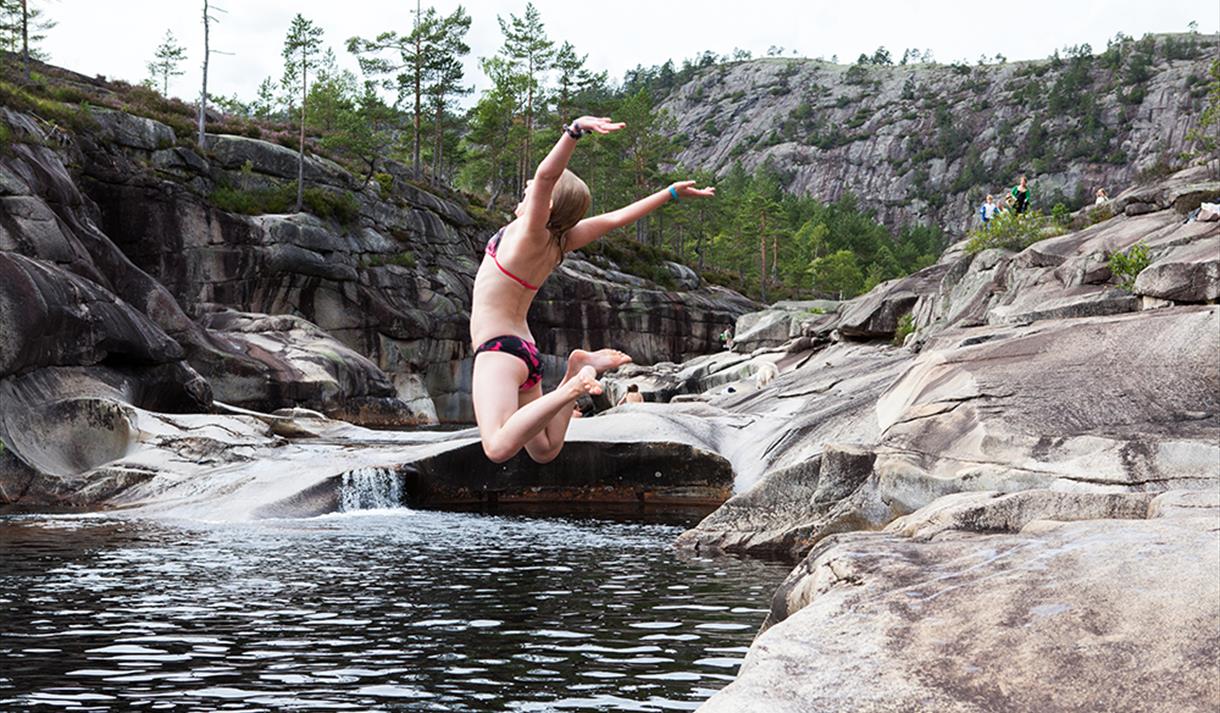 Along a stretch of approximately 300 meters, the potholes are densely packed – from small "footbaths" to deep pools and natural slides. The narrow valley and the warm rock slabs give you a genuine "Sørlandet" (Southern Norway) feeling. Jettegrytene has been a local favorite for generations and is today among Nissedal's most photographed natural phenomena, and has been named Telemark's finest swimming spot several times.