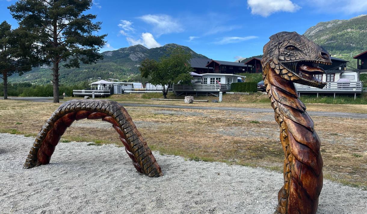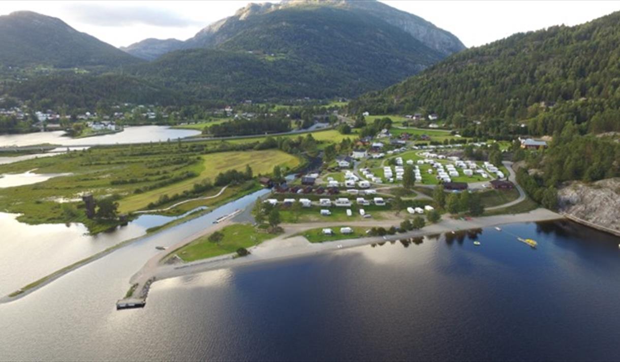 The campsite is located close to RV36, 400 meters from the E134, and حوالي 1 km from Seljord town centre. Despite its proximity to the roads, the campsite and beach are sheltered from traffic and are popular among both tourists and locals—especially those visiting the Sea Serpent Tower or the beach.