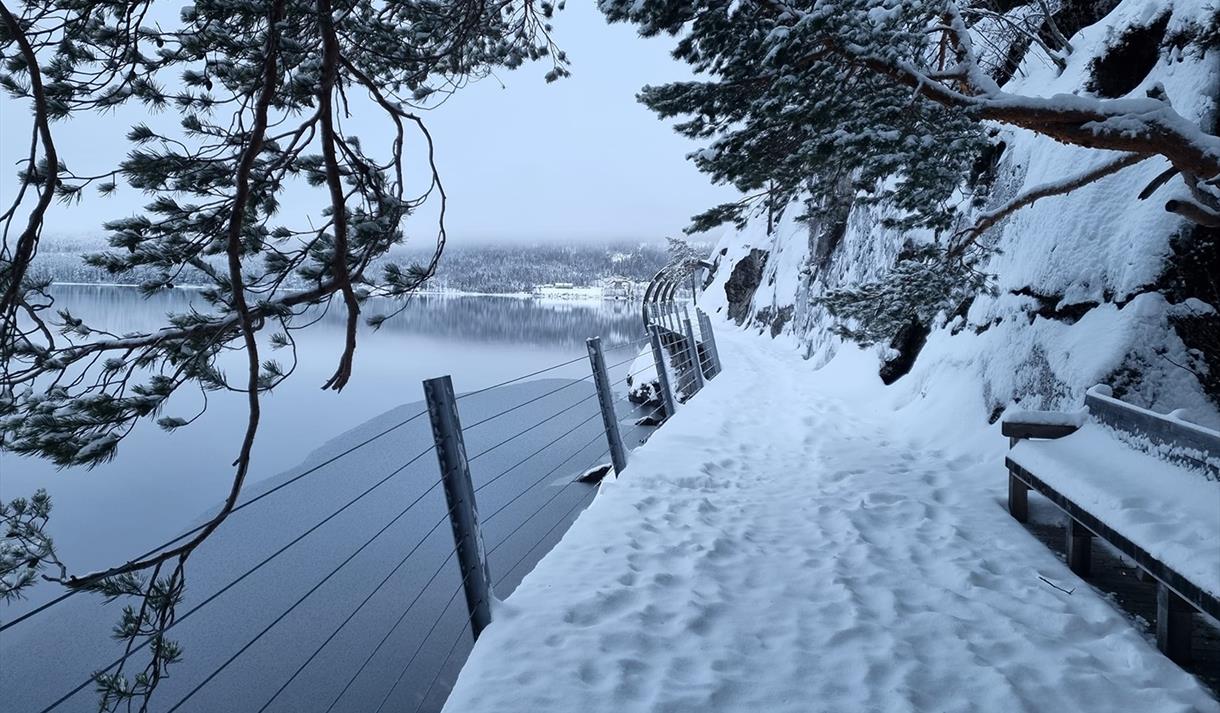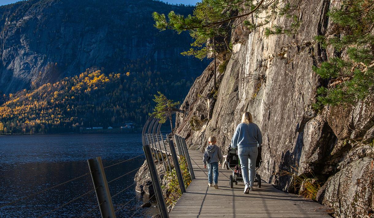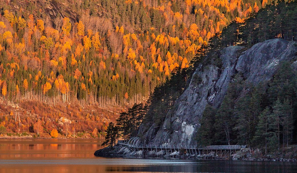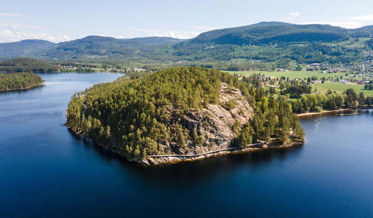 You can take a stroll through the forest 15 meters above the ground. The new treetop trail is a spectacular 1 km long and 2 meters wide plank boardwalk that extends on pillars all the way to the top of Hamaren (Klokkarhamaren). At the end of the trail, there is an observation circle with a diameter of 45 meters, providing a fantastic view over lake Fyresvatn.