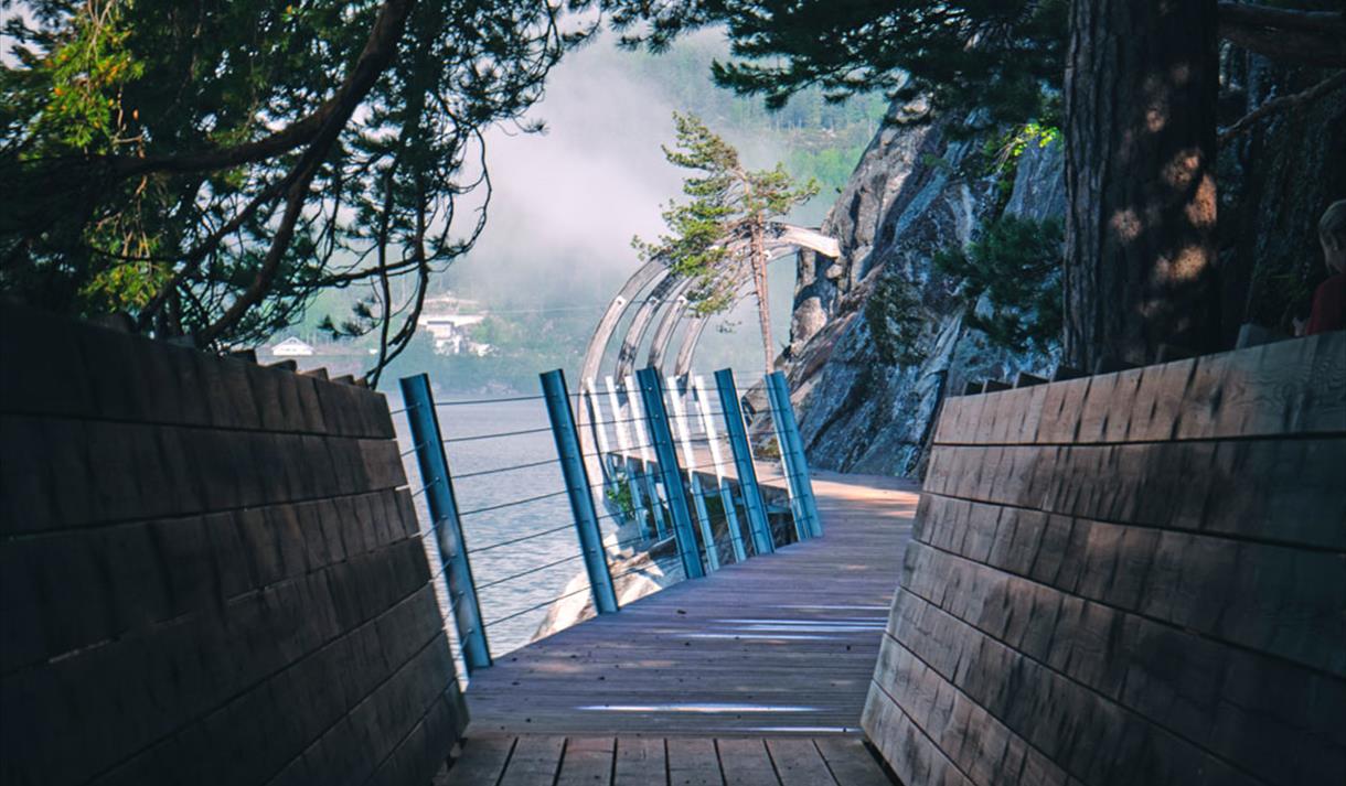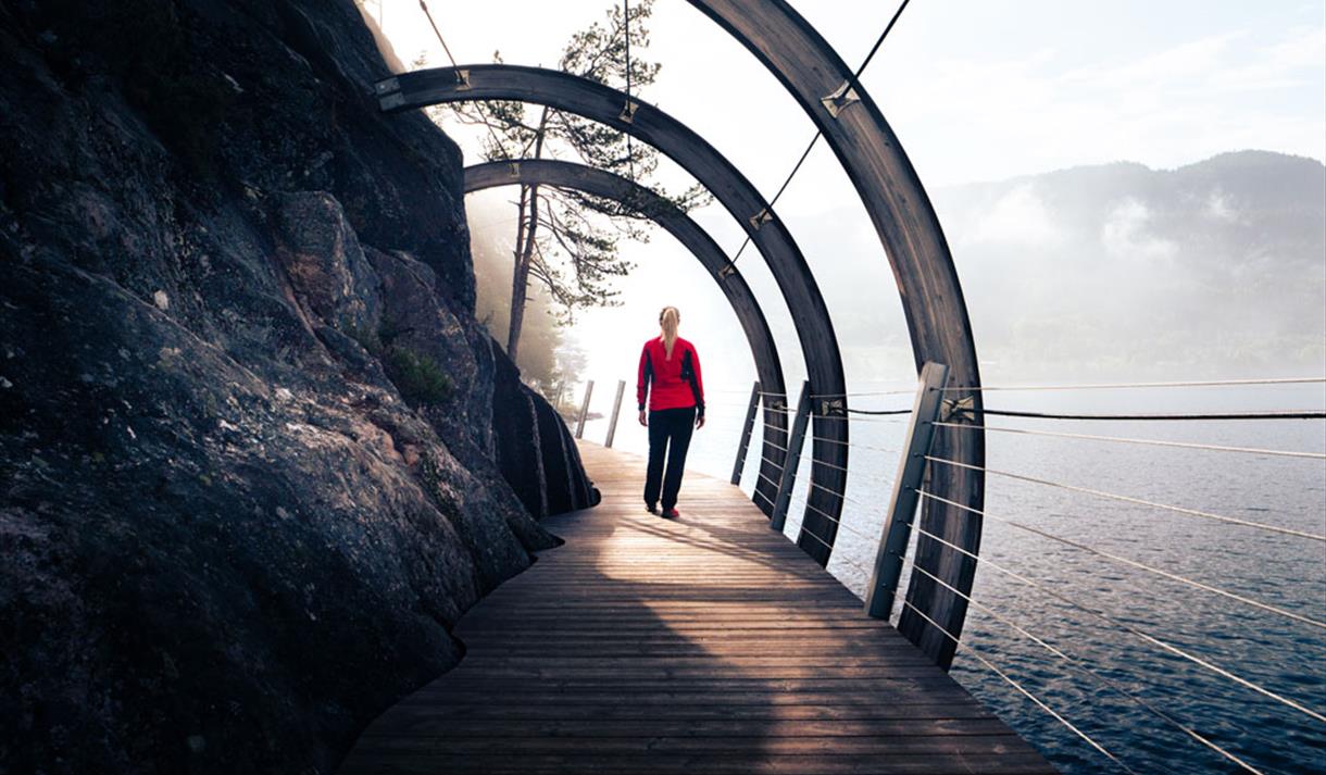 The trail runs along the water, past Munkhola, before entering a wooden bridge constructed like a timber chute, reminiscent of the logging era in Fyresdal. The path then continues on a spectacular pedestrian bridge around the southernmost point of Hamaren before transitioning back into a timber chute towards the outdoor kitchen and barbecue hut.