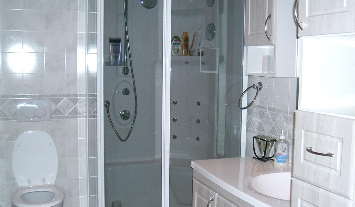 Kitchen, shower and toilet.
